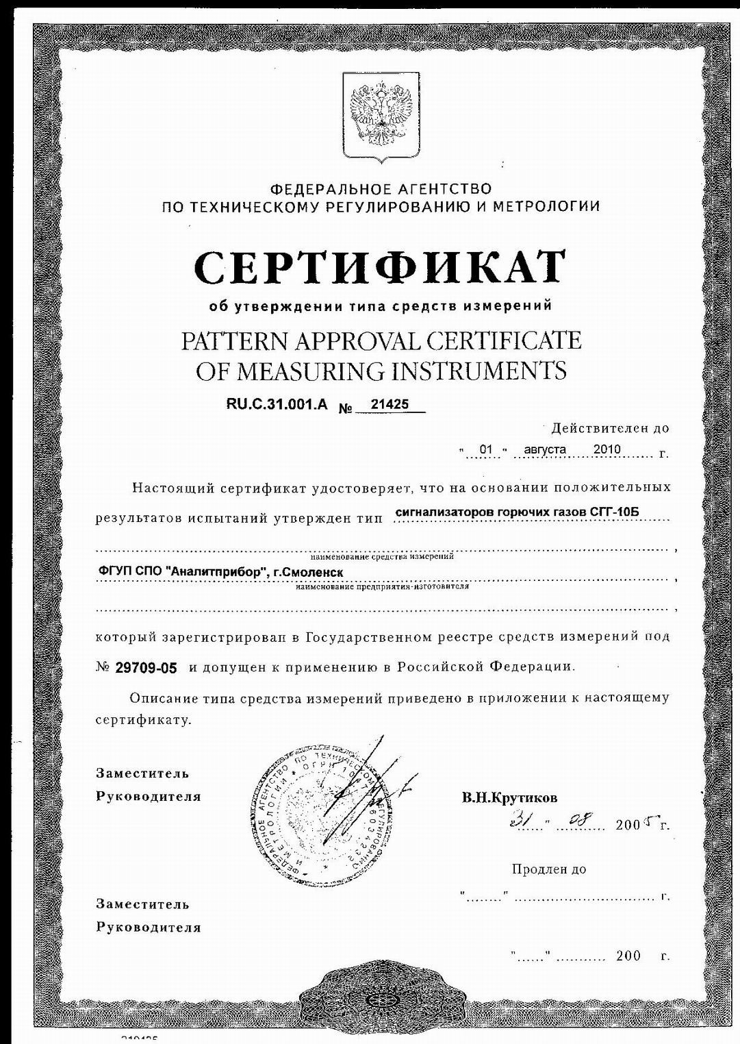 Сертификат об утверждении типа средства измерения на сигнализаторы газа СГГ10Б |