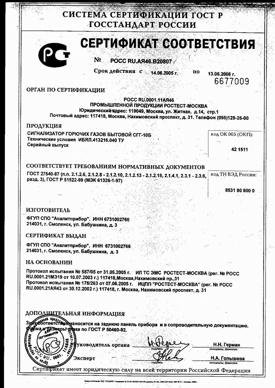 Сертификат соответствия на сигнализаторы газа СГГ10Б