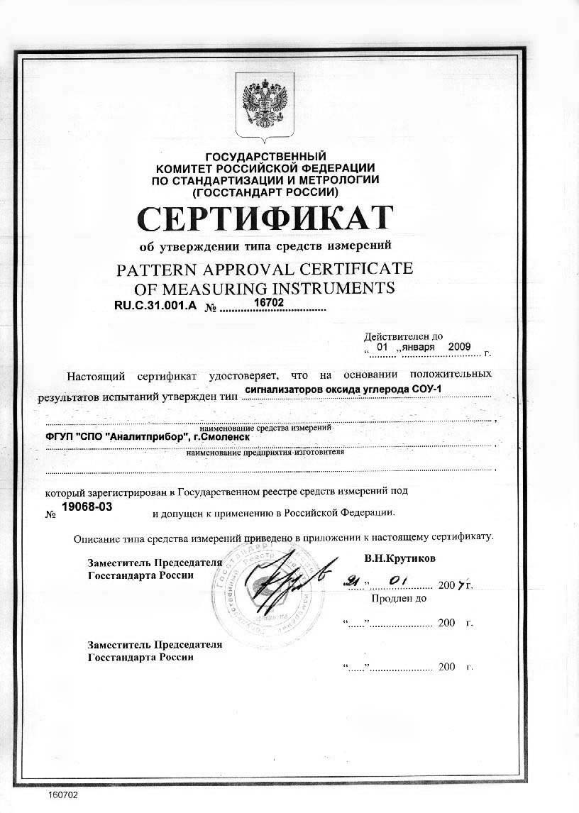 Сертификат об утверждении типа средства измерения на сигнализаторы СОУ-1 |